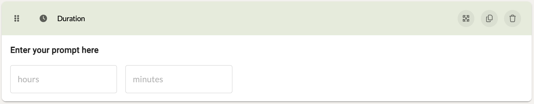 A Duration component allows participants to set the duration of a particular session in hours and minutes. This can be helpful when asking a Coach the length of time their coaching session lasted. You can also select to have the Duration component operate with a Start Time and End Time instead.