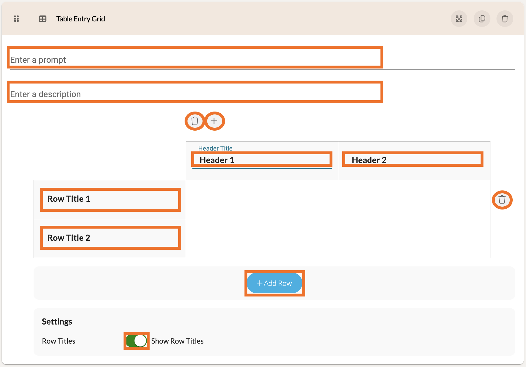 Clicking on either the Header Title or the Row Title will display options to either delete the current column/row or to add an adjacent column/row.
