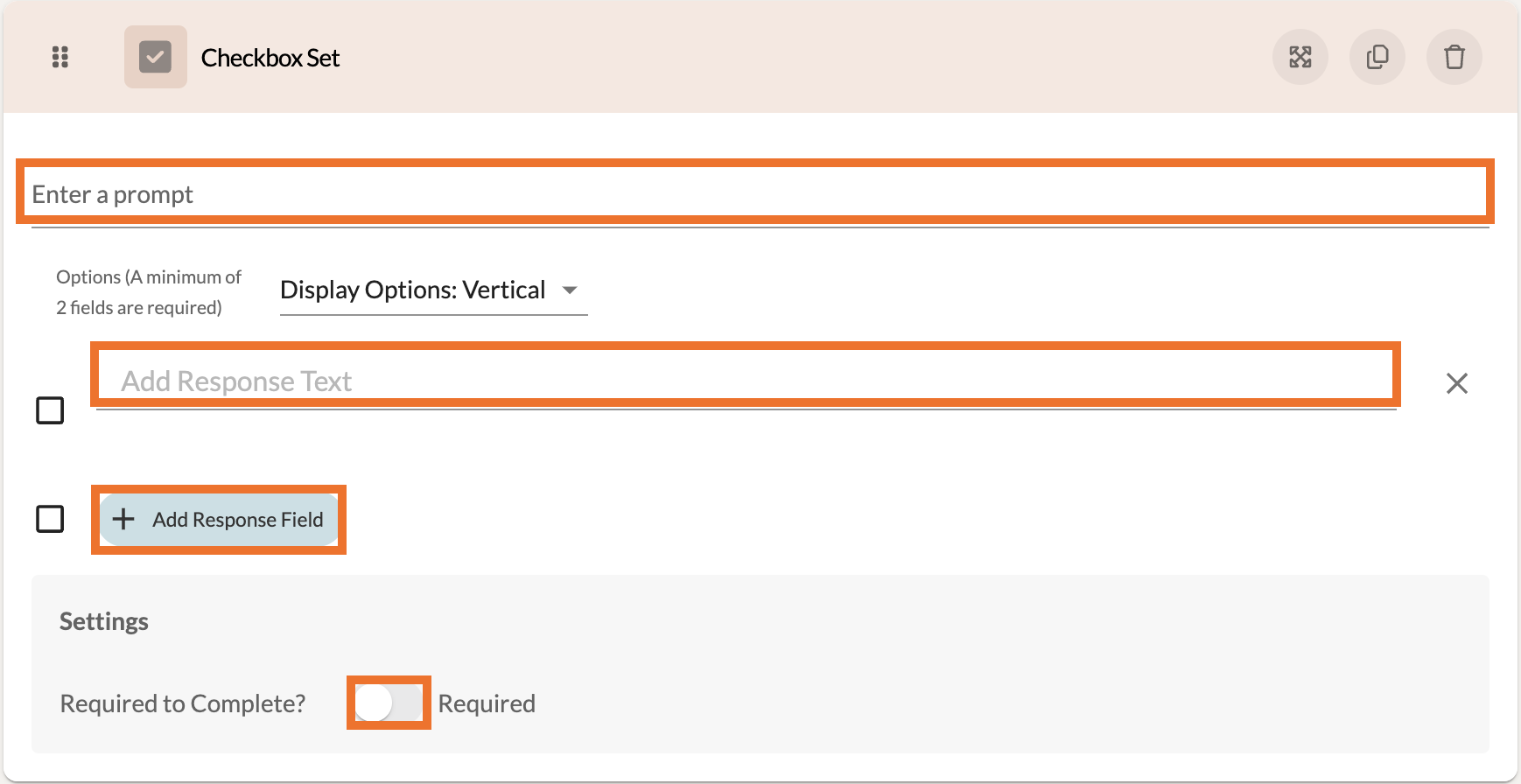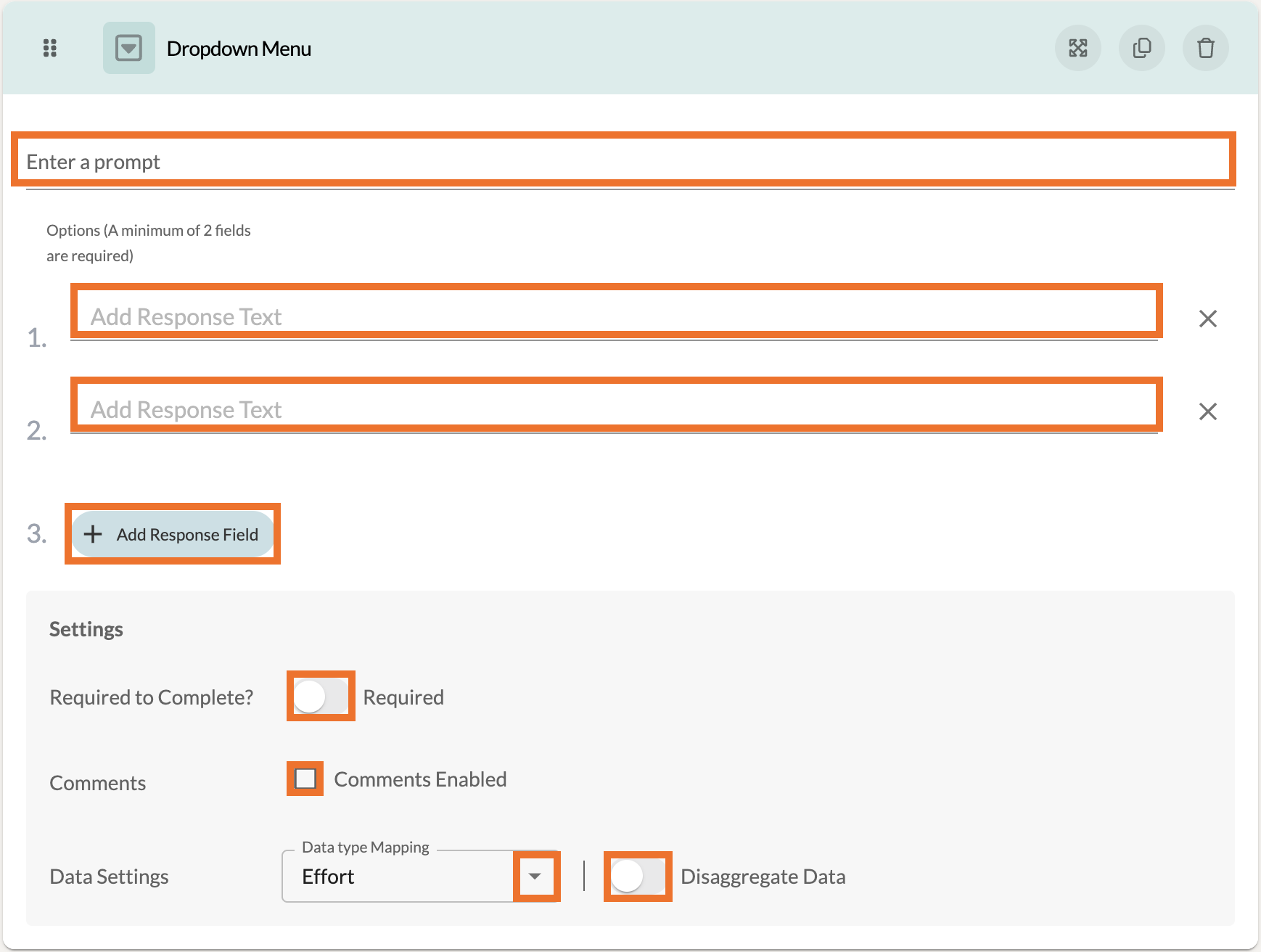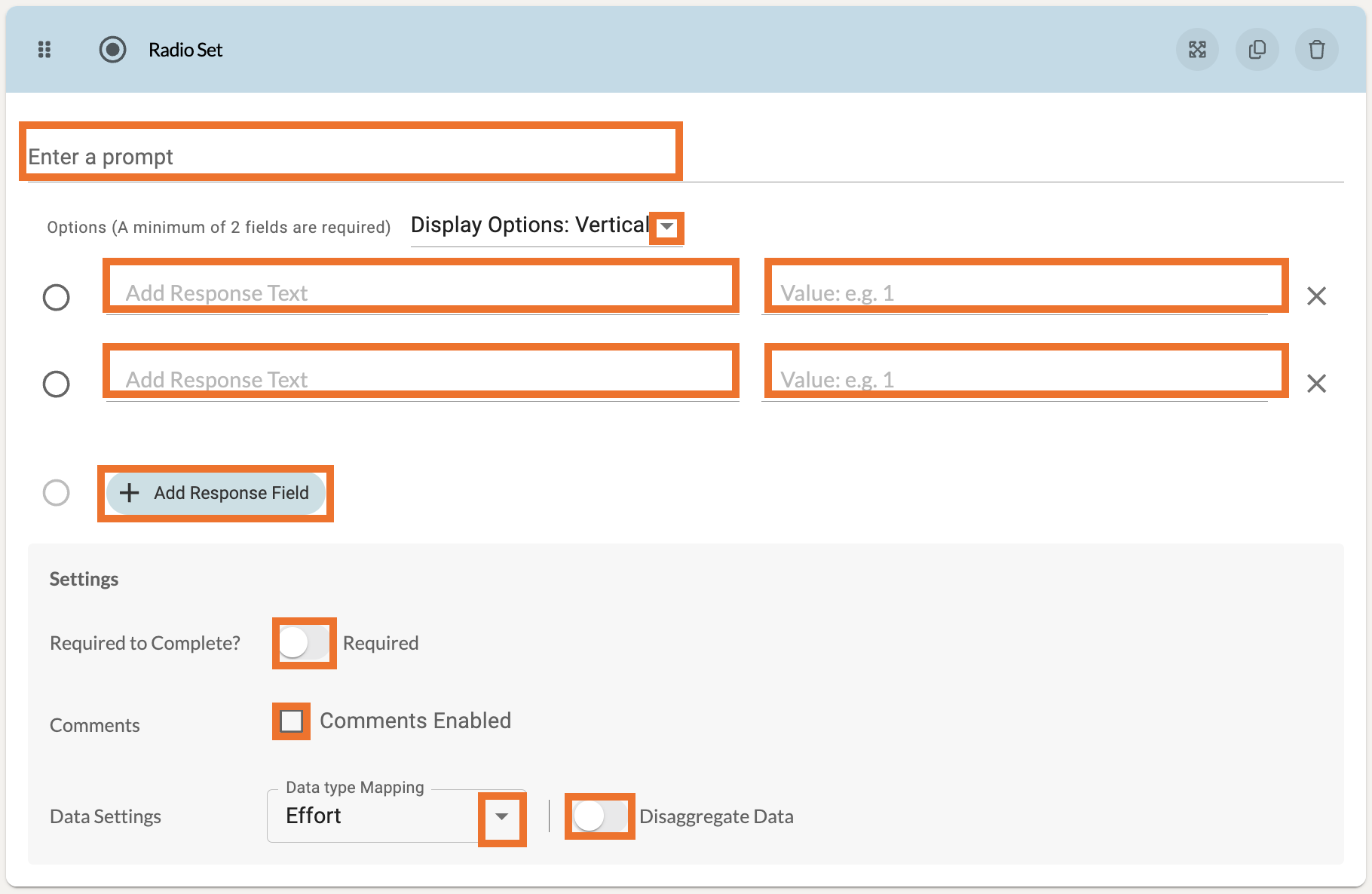 At the top of these settings, add a prompt to guide the participant. Make sure to add response text for the Response Field. If you would like for a response field to have a score/value, you can enter that beside the response text.