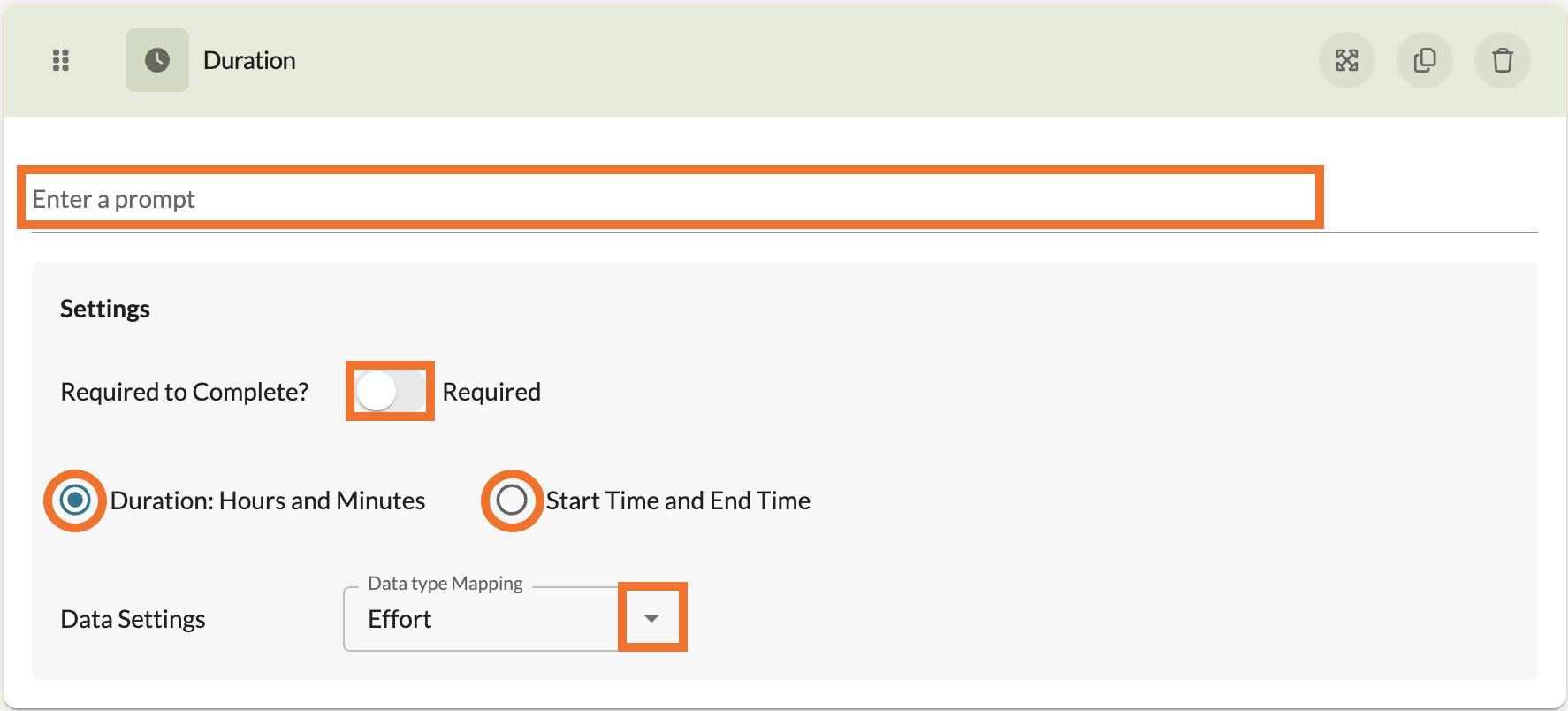 At the top, add a prompt to guide the participant. You can also select to have the Duration component operate with a Start Time and End Time instead, in which case the reporting of this data will display the duration between those times given. You can also adjust if this component is Required to progress.