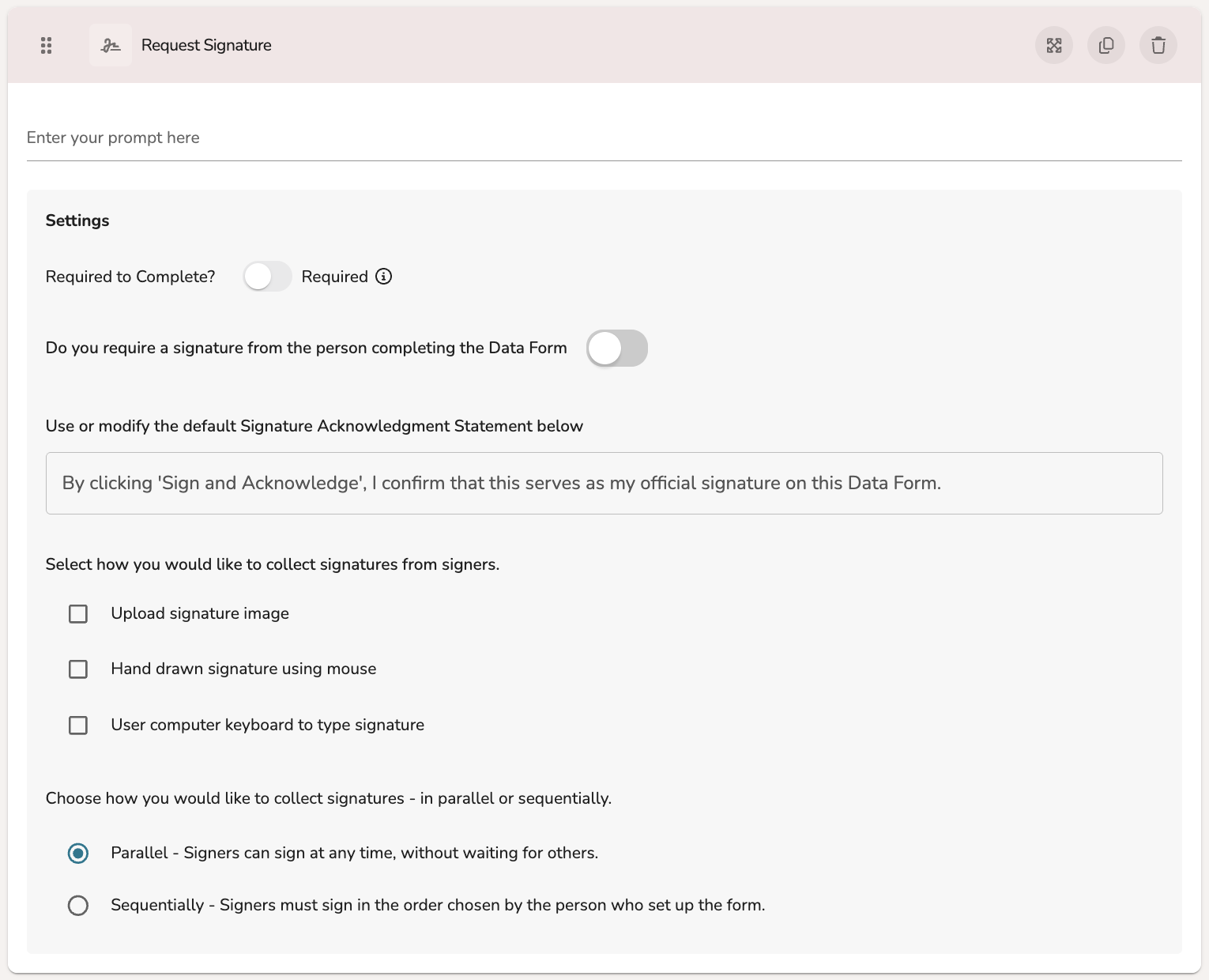 At the top, add a prompt to guide the participant. You can then mark the signature collection as 'Required' in order to complete the form. You can also mark the signature component as requiring the user completing the form to provide their signature. In other cases, you may want to only have your signature collection be for users who have shared access to the form, or a mixture of both!