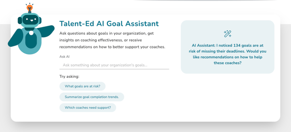 If you have access to our Goals AI Assistant add-on, you as an Admin will have access to our Talent-Ed AI Assistant from your Goals hub page in Coaching Corner under the Managing Coaching view. Here you can ask the AI Assistant specific questions regarding the assigned goals of your system. The AI Goals Assistant will respond accordingly to your question!