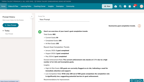 For example, when asked to 'Summarize goal completion trends,' the AI Assistant provides a brief overview of all current goals, completed goals, and at-risk goals, noting any recent trends: