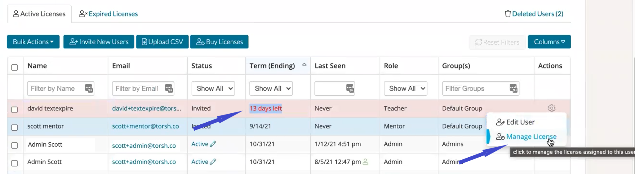 All accounts in TORSH Talent are granted a license term, either based on the overall contracted End Date of your system or based on a specific Term (Ending) purchased for a separate set of licenses. All current term licensed accounts will display on your Users Management page under the 'Active Licenses' table until they reach their license expiration date.