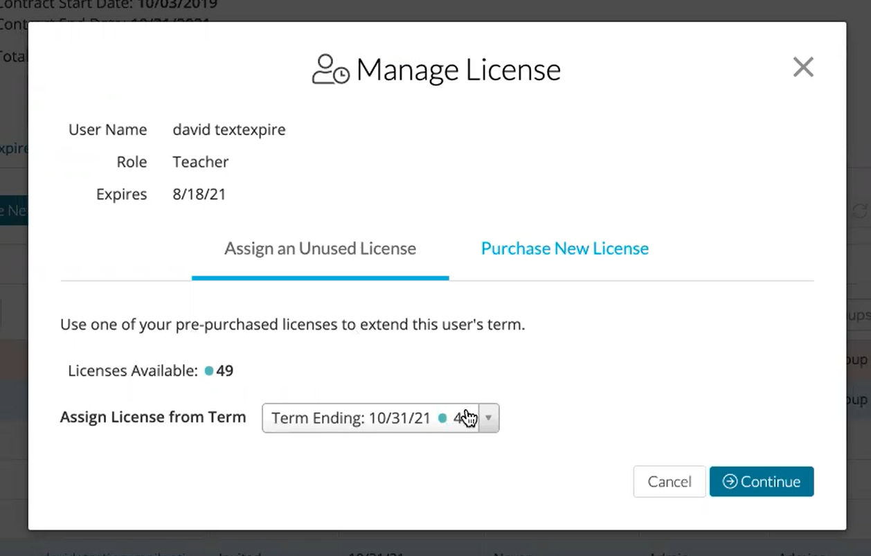 When you select 'Manage License,' the Manage License pop-up will appear. Here you can assign an available/unused license term for the account. This window also gives the option to purchase a new license if there are no more unused licenses.