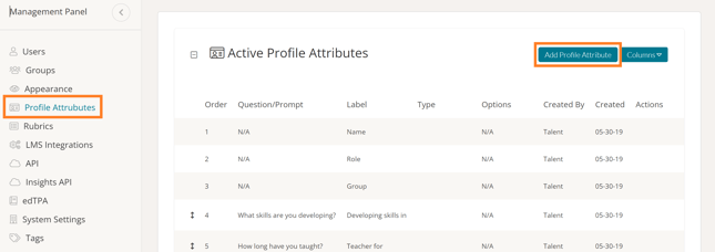 To create and manage custom Profile Attributes, Admins can navigate to the ‘Profile Attributes’ tab of the Management panel. On this page, you will see your ‘Active Profile Attributes’ and your ‘Archived Profile Attributes.' To add a profile attribute, click ‘Add Profile Attribute.’