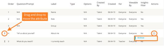 Once you publish the Profile Attribute, it will live on your ‘Active Profile Attributes’ list. If you don't want a Profile Attribute to be visible to your users, you can archive it. To do so, click the gear icon in the Actions column, and select ‘Archive.’