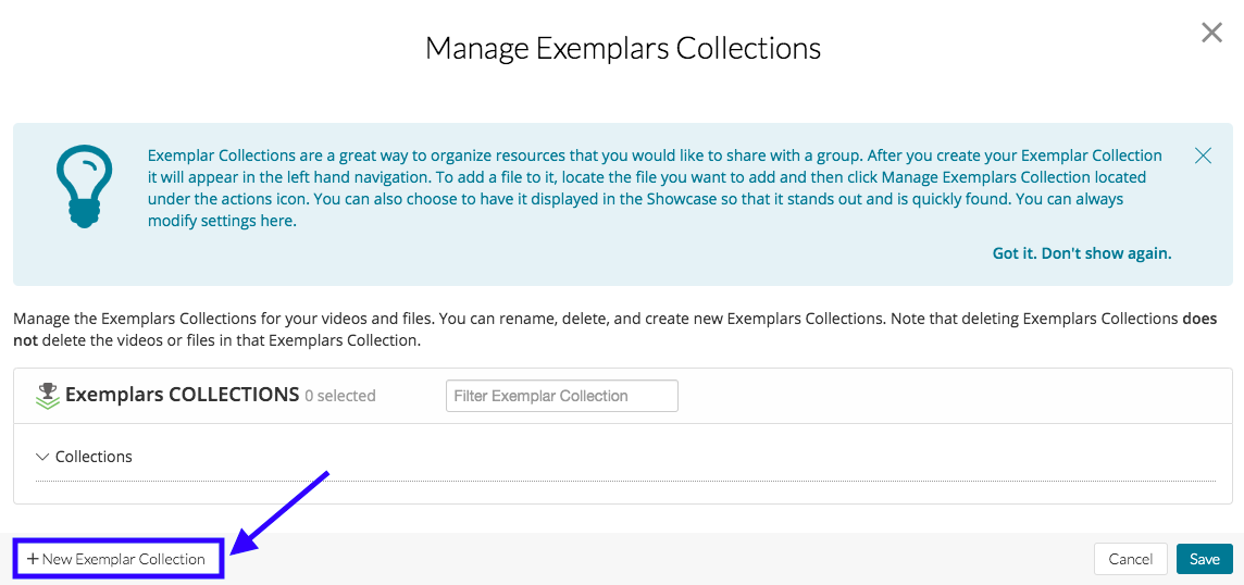 As a user in the Admin or Coach role, you can organize the files in the Exemplar Library by creating Exemplar Collections. Exemplar Collections are a great way to organize resources that you would like to share with a group.