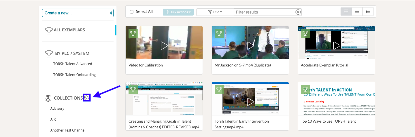 Once on the Exemplars page, select the gear icon next to Collections on the left hand navigation.