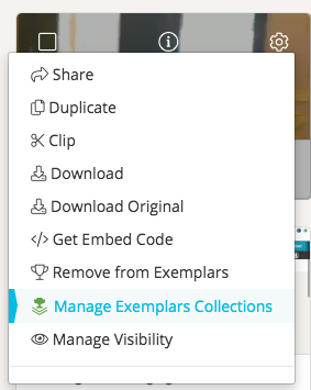 After you create your Exemplar Collection it will appear in the left-hand navigation. To add an artifact to it, locate the artifact you want to add. Hover over the gear icon and click 'Manage Exemplars Collections'. Then select the Exemplar Collection(s) you want the artifact to be a part of.