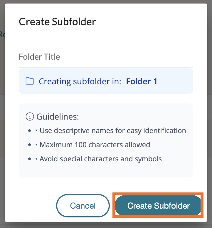 2. In the pop-up that appears, give your subfolder a title. Then click 'Create Subfolder.'
