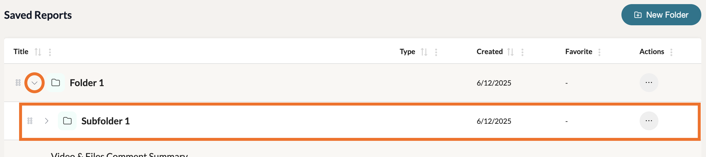 1. To create subfolder, find your folder listing in your Saved Reports. Then click its '...' icon and select 'Create Subfolder' from the dropdown.
