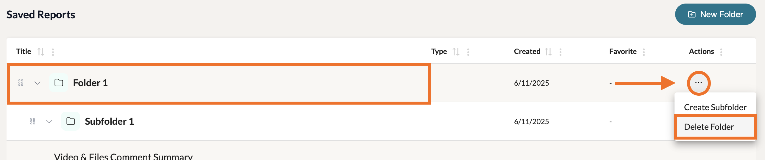 1. If you would like to delete a folder or subfolder, first locate the folder at the top of your Saved Reports list. Click on its '...' icon and select 'Delete Folder.'
