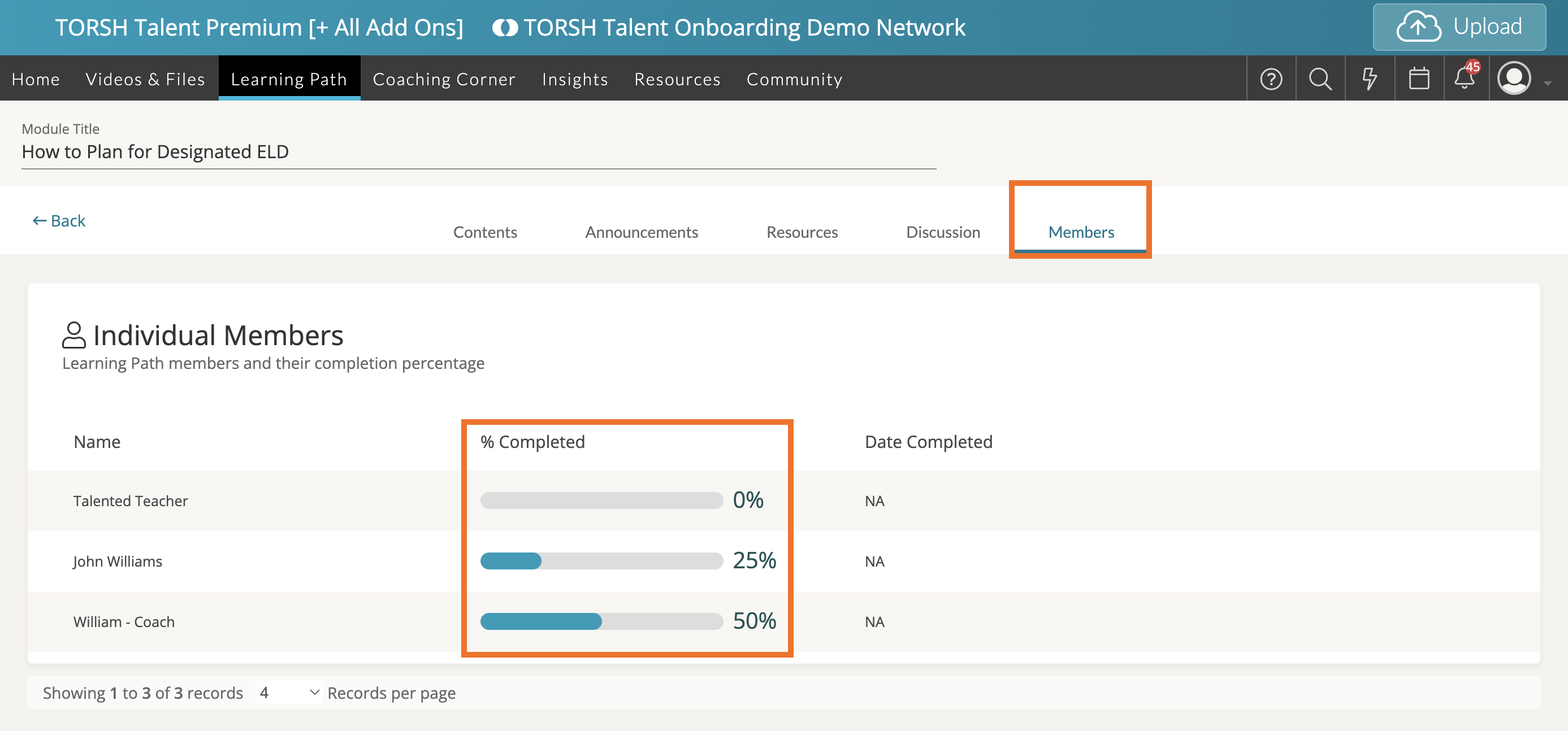 Within a Learning Path Module , you can see your progress in a module by clicking on the 'Members' tab and viewing the progress bar next to your name under the '% Completed' column. The progress bar will tell you how much of the module is complete. A page is considered complete, once you click 'Mark as Complete.'