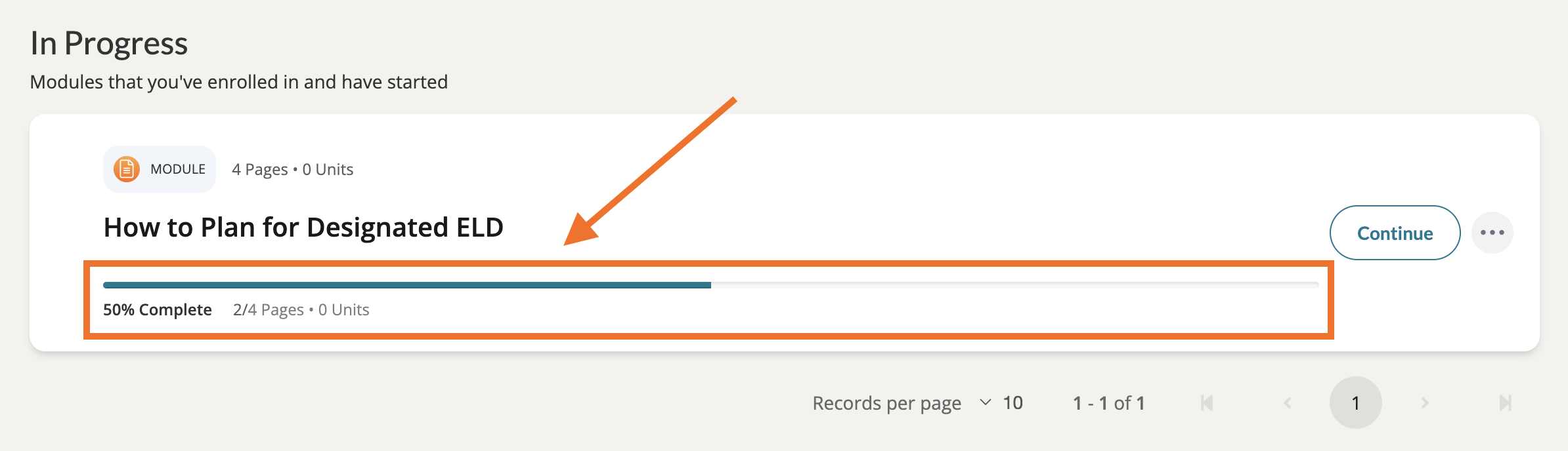 You can also see your progress in each module you are participating in on your 'My Modules' page. For your modules you've enrolled in but have not started, scroll to the 'In Progress' section. You will see your your progress mirrored here for each module, complete with a progress bar and a percentage score, as well as the total number of pages you have marked as complete.