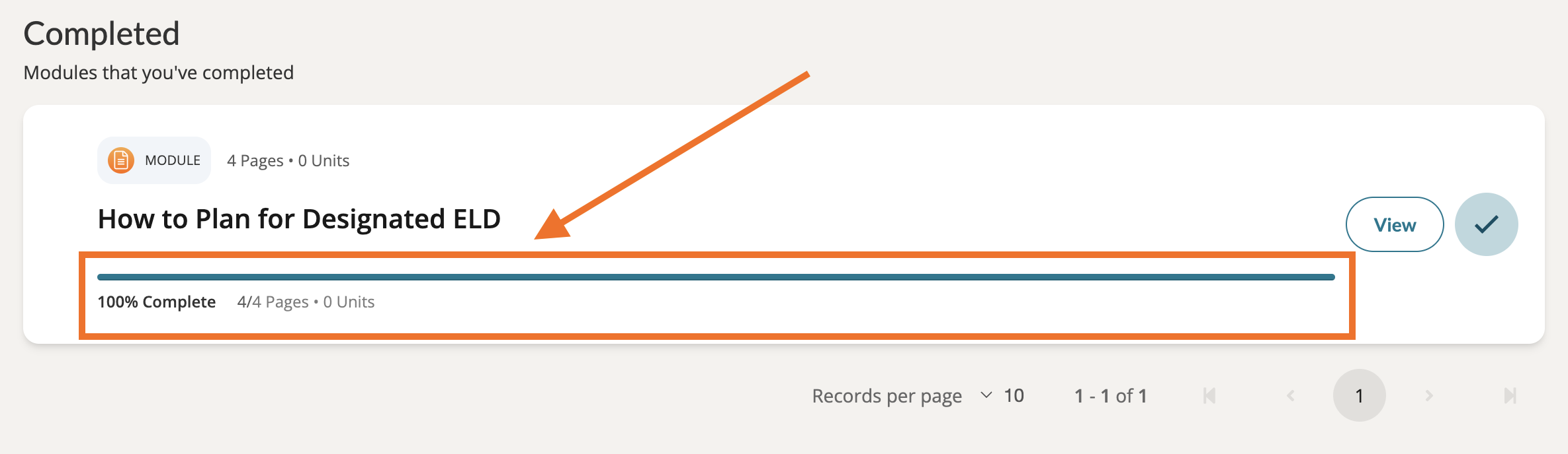 Once you have completed a module, you will find it listed under the 'Completed' section of your My Modules page. Here you will find the completed progress bar and a percentage score, the total number of completed pages, and your units awarded - if applicable.