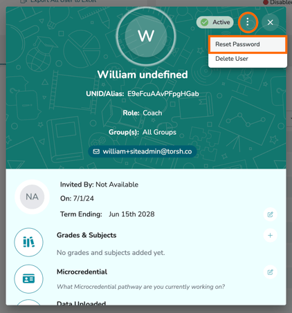 This will open the User Details window. From here, find the '...' icon in top, right-hand corner of this pop-up window. In the dropdown that appears, click 'Reset Password,' and a link will be generated and sent to their email inbox.