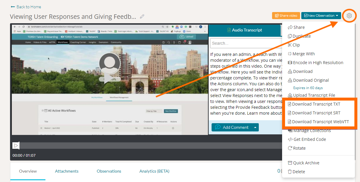 When the Audio Transcript is uploaded and attached, users will be able to download the transcript by selecting the video's 'gear icon.' They will then have the option to download the transcription as a .TXT, .SRT or .VTT file.