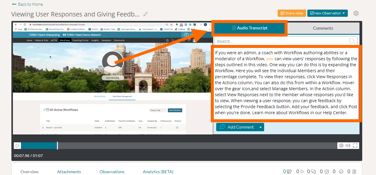 Select 'Upload Transcript' to be taken to the upload modal where the .SRT or .VTT can be chosen to upload. Once the transcript file is uploaded, the user will see the Audio Transcript next to the video.