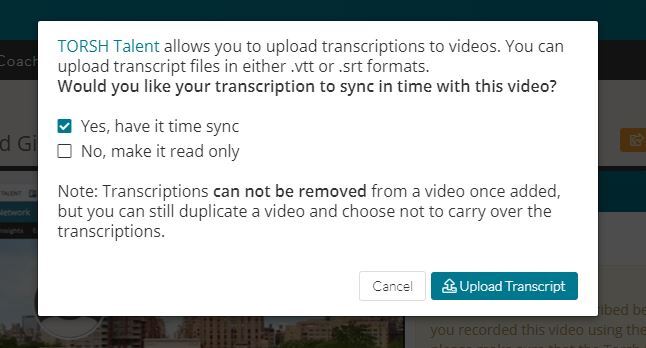 In TORSH Talent, you can upload a caption/transcript file (in either .SRT or .VTT format only) to your video uploads. To do so, navigate to a video you own in your Videos & Files page. Then click on the video's 'gear icon' and choose 'Upload Transcript File' from the dropdown list.