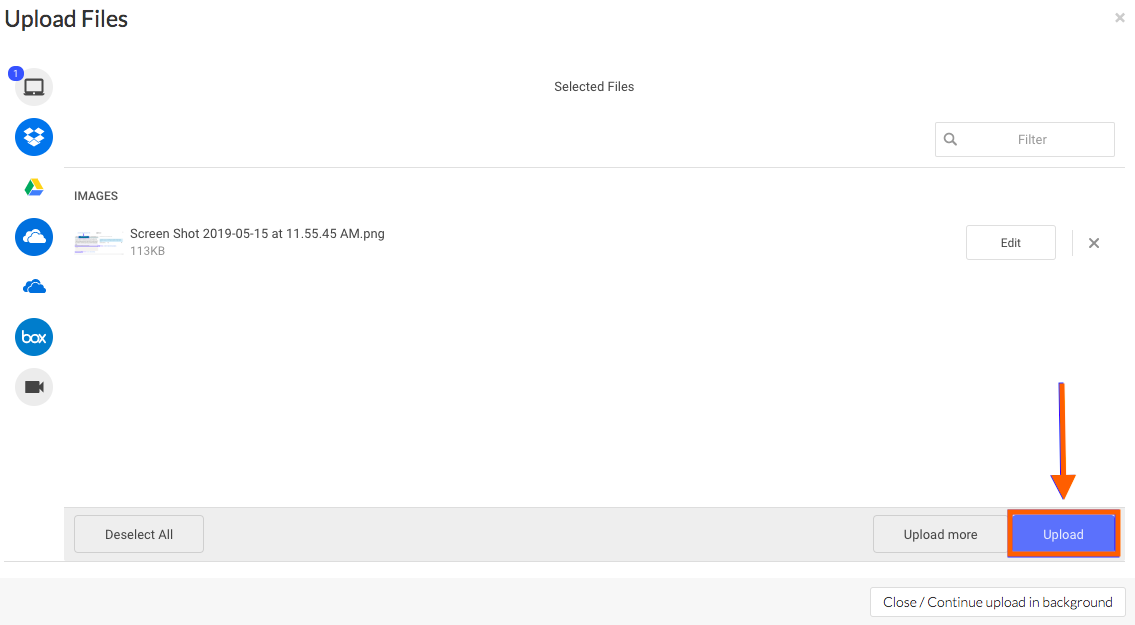 You can upload one or more files from each source listed on the Upload popup screen. You can also drag-and-drop your file(s) into the pop-up modal, or select them using the 'Select Files to Upload' button.