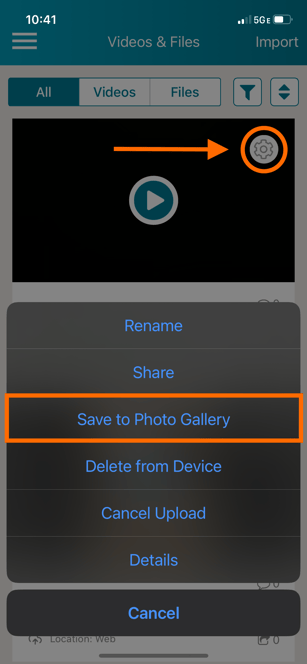 On your Videos & Files page, find the video you accidentally uploaded to the wrong system. Tap on its 'gear icon' and select 'Save to Photo Gallery' in the menu that appears. This will save a copy of the video file to your mobile device's Photos/Gallery app.