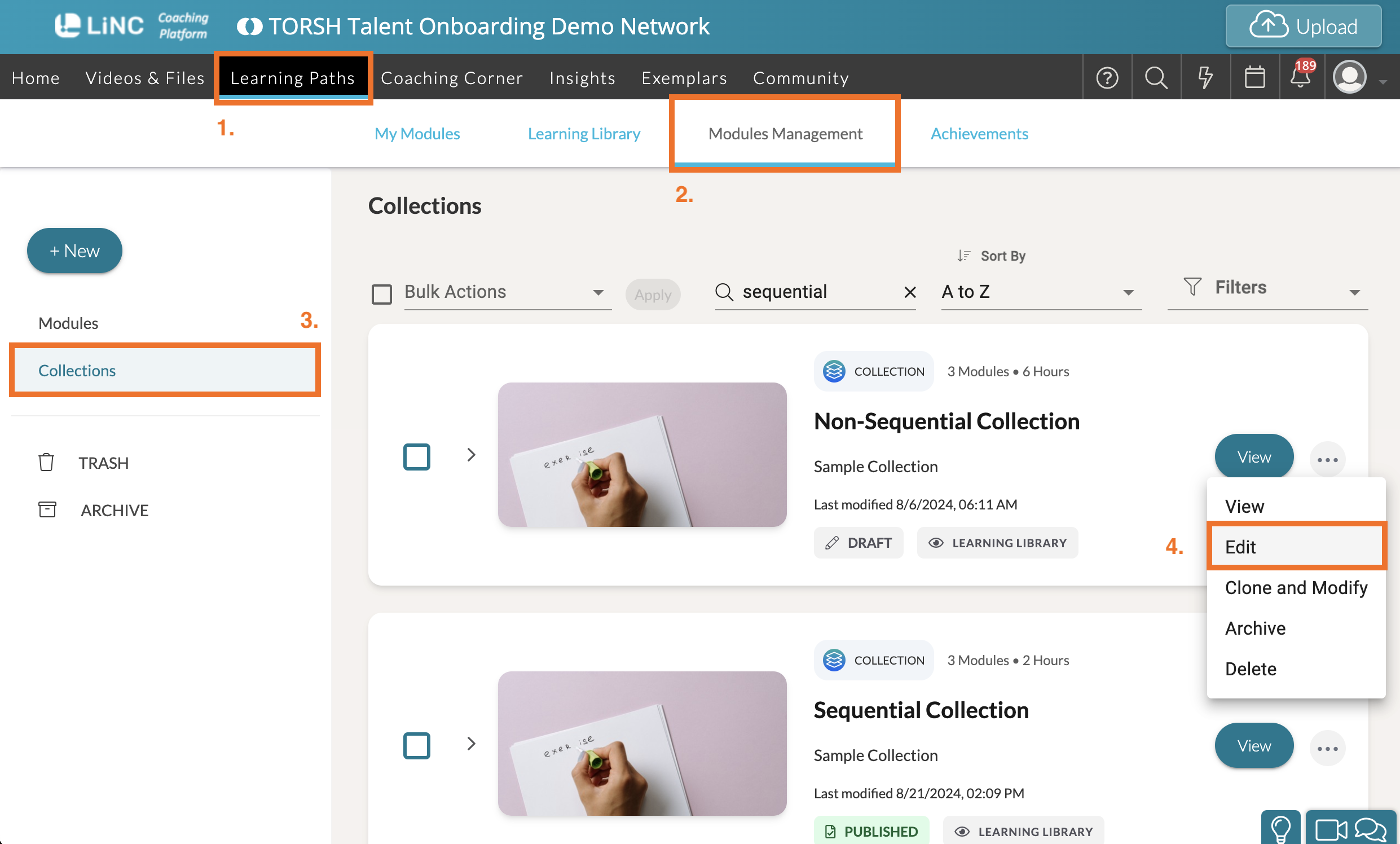 First, navigate to 'Learning Paths' in your top navigation bar. Then click on the 'Modules Management' tab.