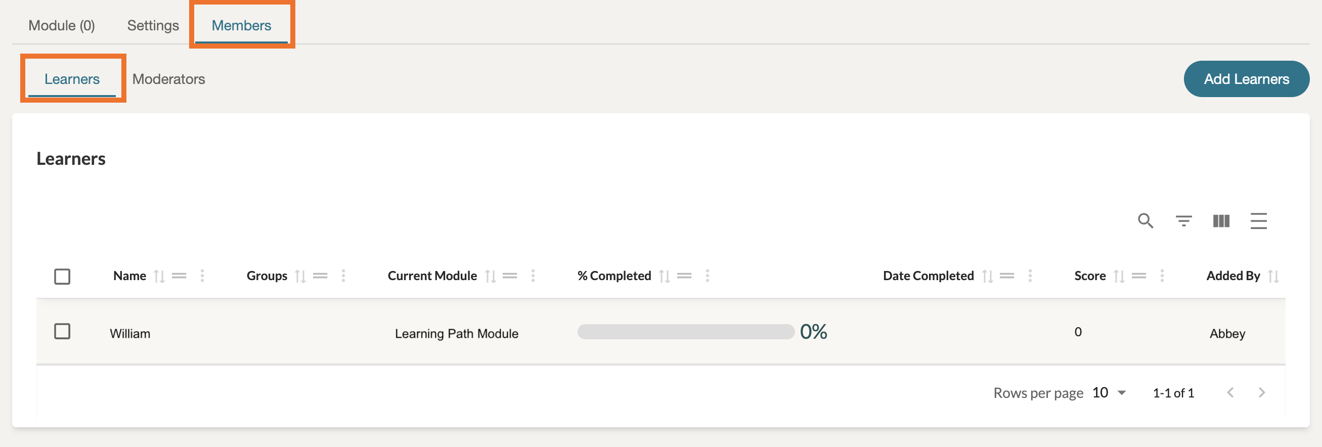 This will take you to the Edit view of your course. Click on the 'Members' tab and make sure you are viewing the 'Learners' tab from there. Here you can view your individual members and their completion percentage of the overall course. You can also see the current module they are progressing through.