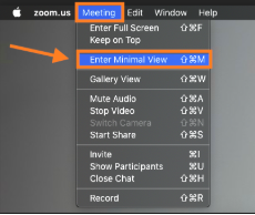To do so, first click on your Zoom meeting window. Next, select ‘Meeting’ from the Zoom menu on top of your computer screen. Choose ‘Enter Minimal View.’