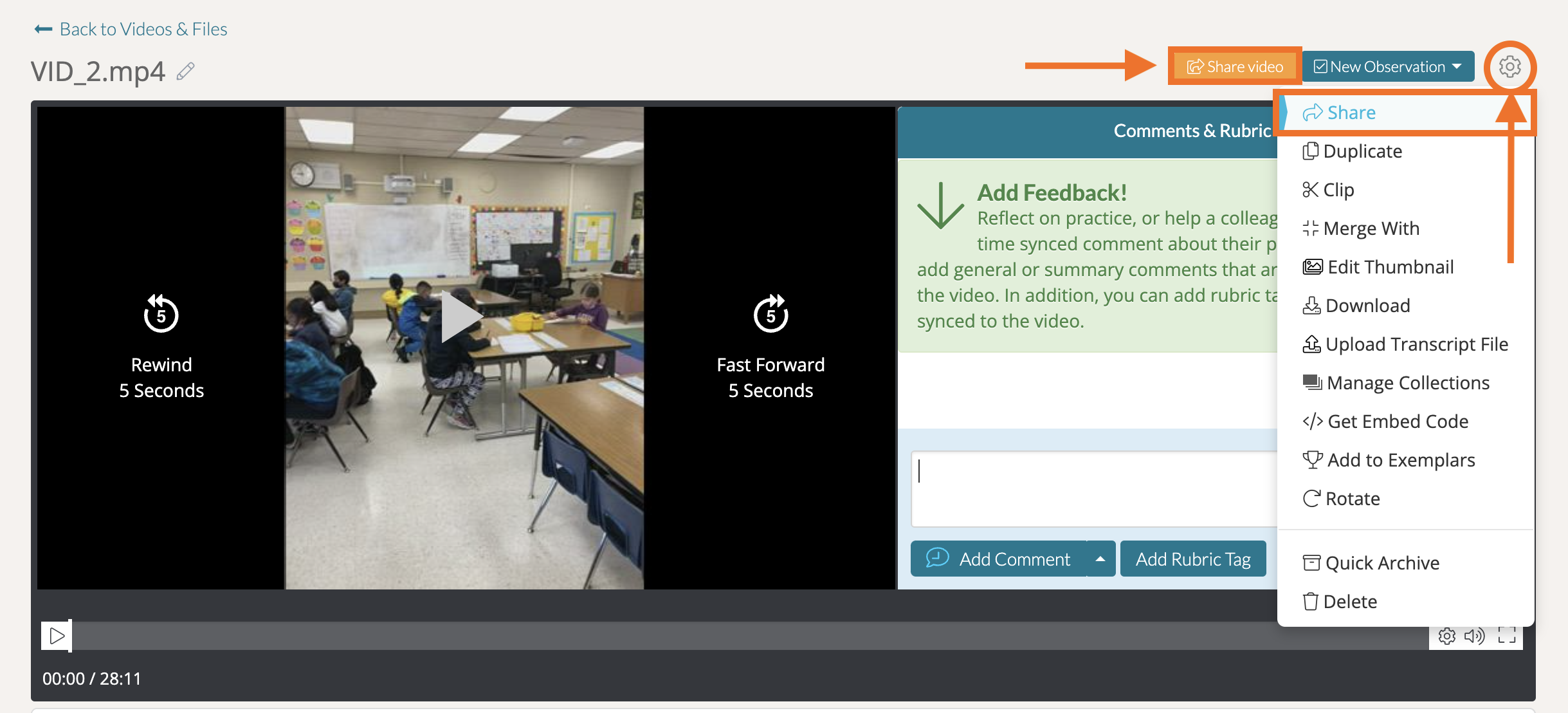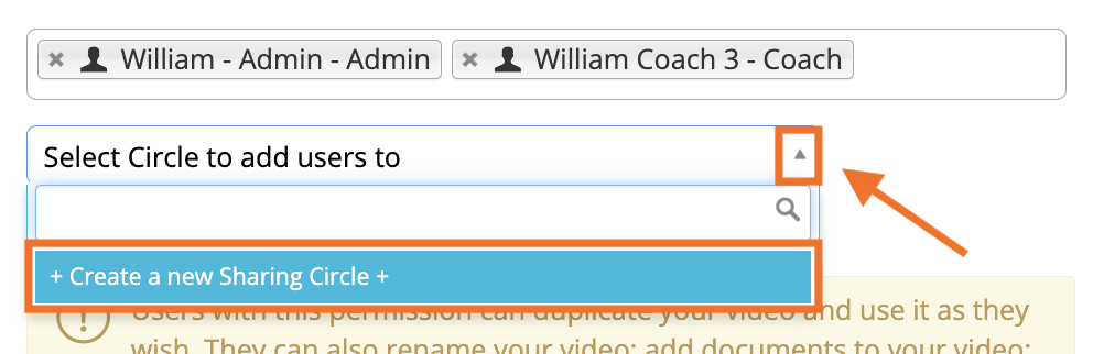 You can also create a Sharing Circle while sharing a video or file. To do so, first access a Share pop-up window by clicking the orange ‘Share’ button on any artifact's webpage or by clicking on a specific video/file's 'gear icon' in the right-hand corner and selecting ‘Share’.