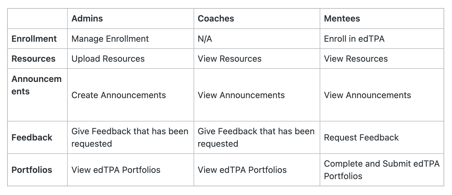 What are the differences between role types in edTPA? Please see the edTPA capabilities for each role in Talent below: