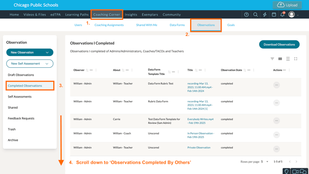 As a System Admin, you will automatically be granted View access to all observations completed in your system. If you would like to see all of the observations conducted by other Coaches and Admins in your system, first navigate to Coaching Corner. Next, select the 'Observations' tab. Click on 'Completed Observations' and then scroll to the section titled 'Observations Completed By Others.'