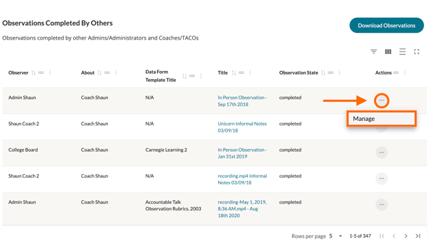 In this table, you will see a list of all of the observations completed by other Coaches and Admins in your system. To view an observation, click on a specific listing's '...' icon and select 'Manage' in the dropdown menu. This will load the observation in a new webpage.