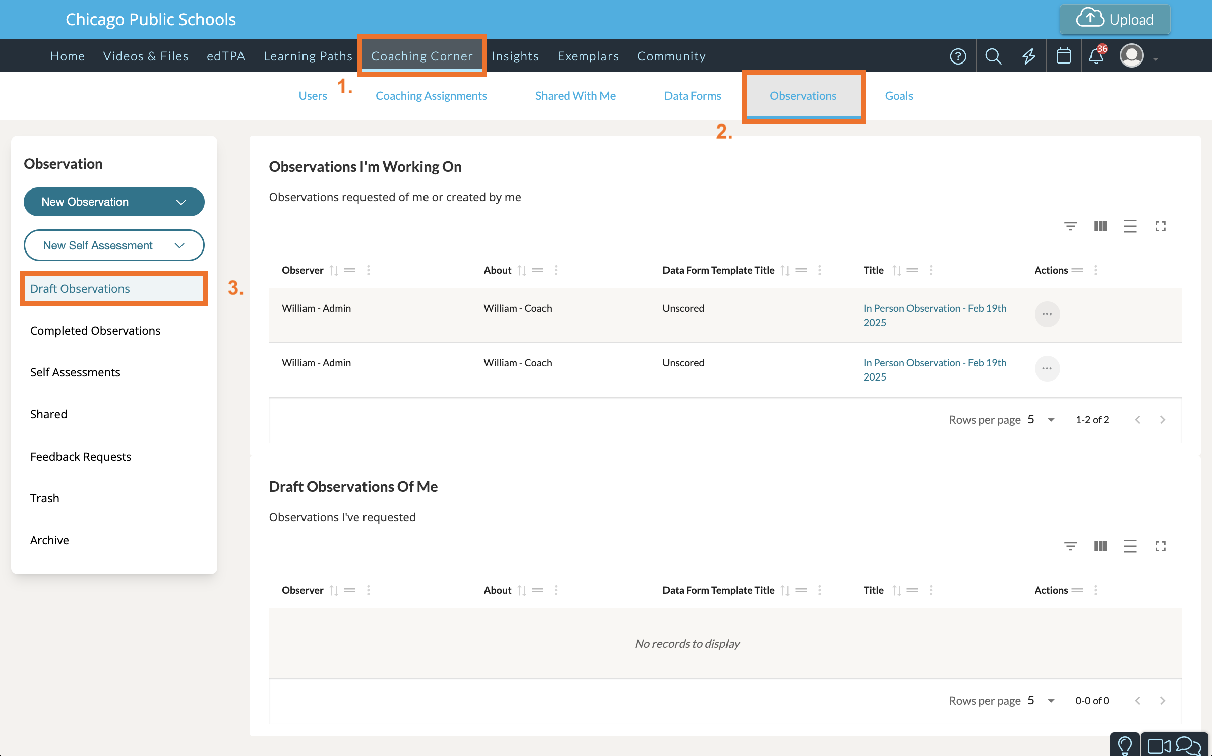 To view your drafted observations, click on 'Draft Observations,' and you will be brought to a page displaying the observations you are working on as well as any drafted observations about you that have been shared with your account.