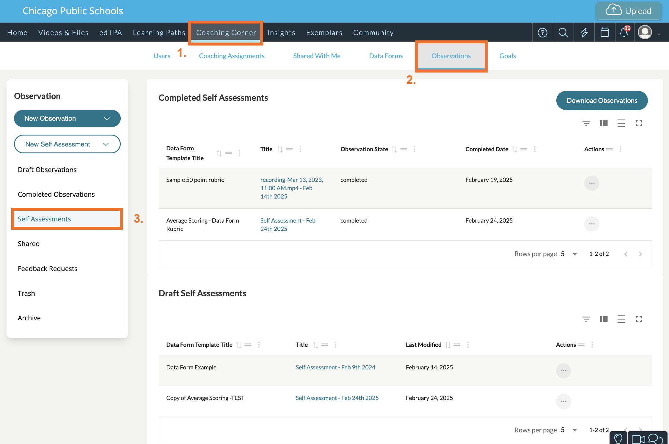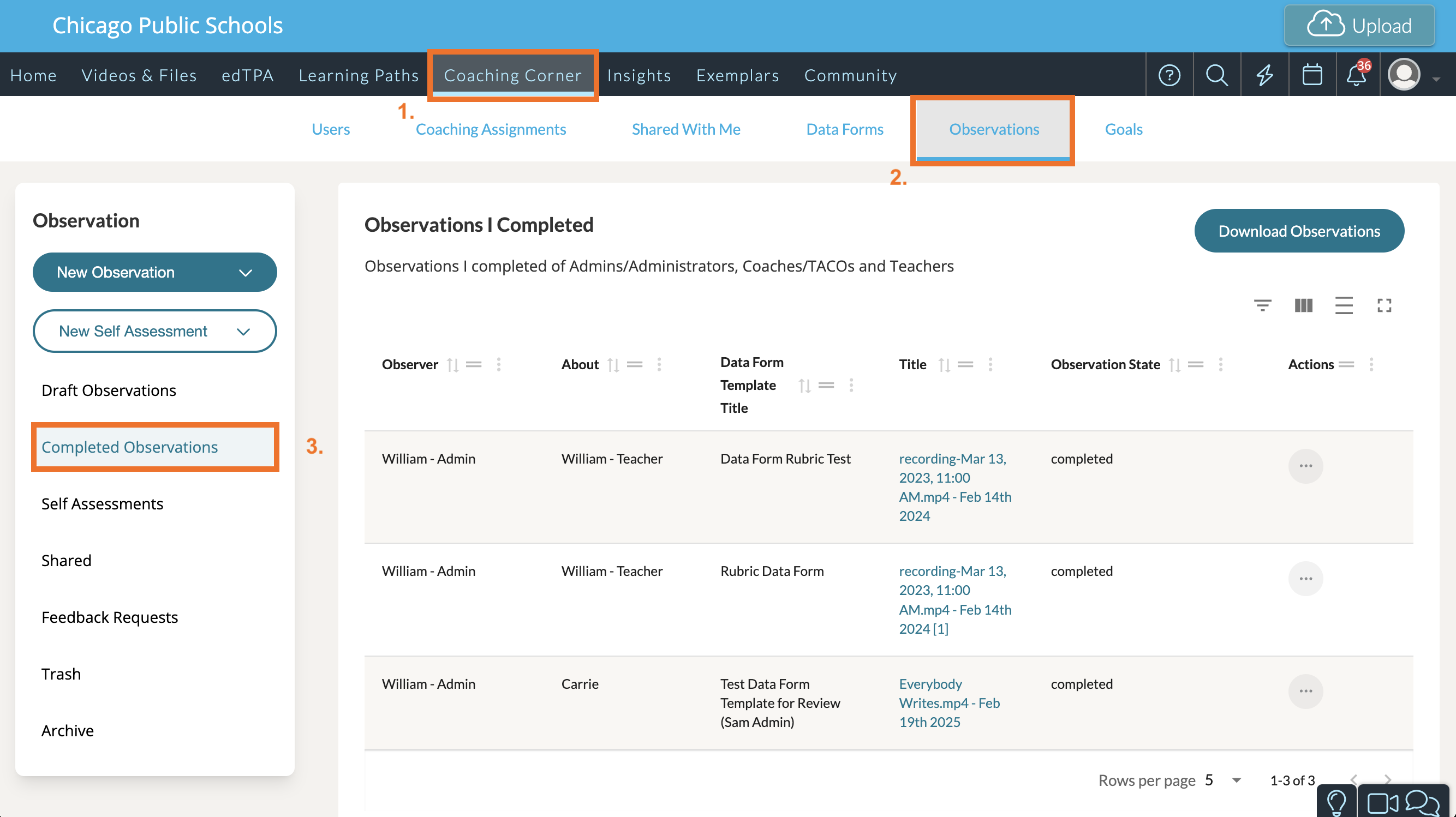 To view your observations you have marked as complete, click on 'Completed Observations,' and you will be brought to a page displaying the observations you have completed, as well as the observations completed and shared for you. If you are an Admin (or a Coach with certain system setting privileges), you will also find a table of observations completed by others.