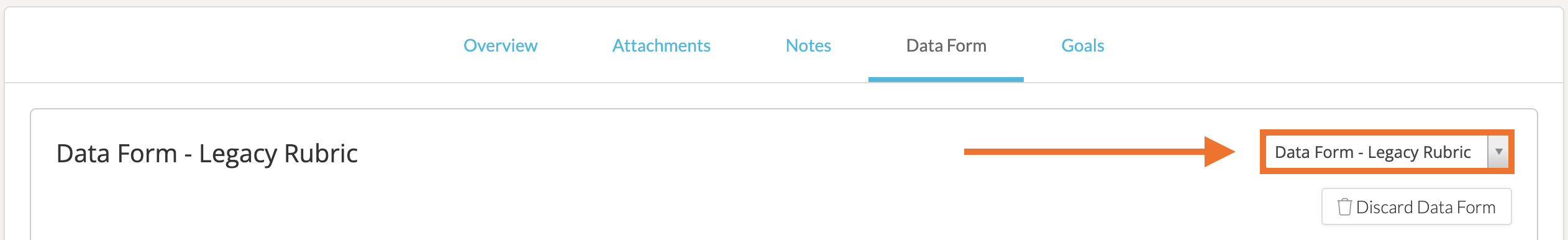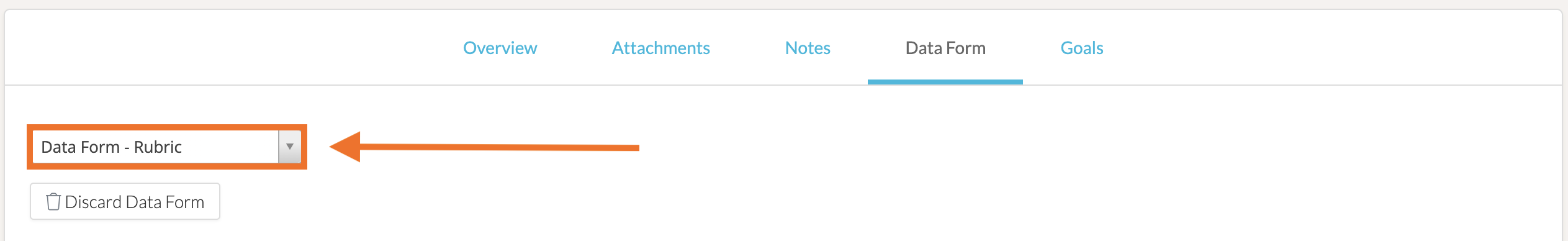 If you want to switch rubrics, you can do so from the 'Select a Data Form' dropdown to the top-left or top-right side of the rubric, depending on the type of rubric template you are completing.