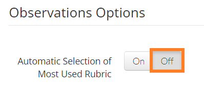 If you do not want your most frequently used rubric to populate by default, you can manage this in your Account Settings by toggling 'Automatic Selection of Most Used Rubric' to 'Off' underneath the 'Observation Options' section.